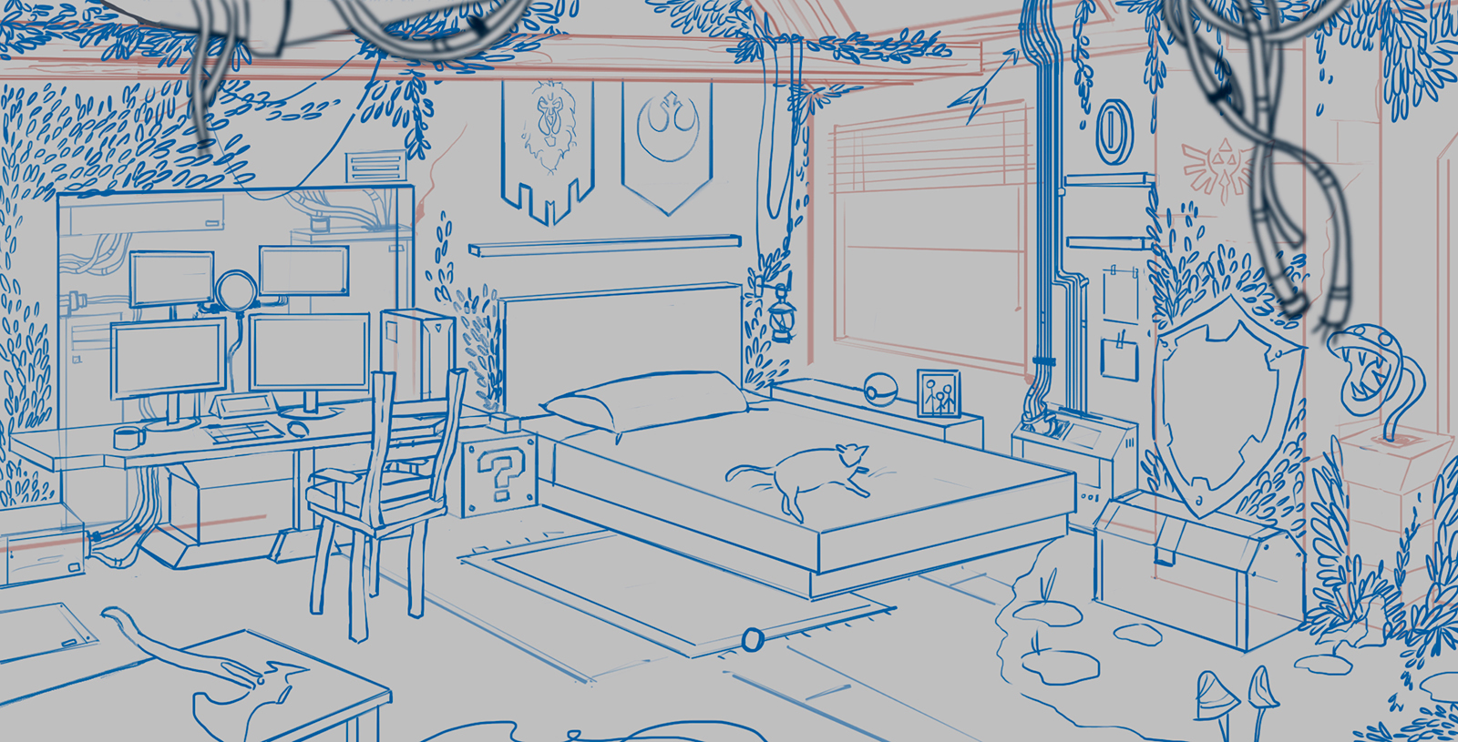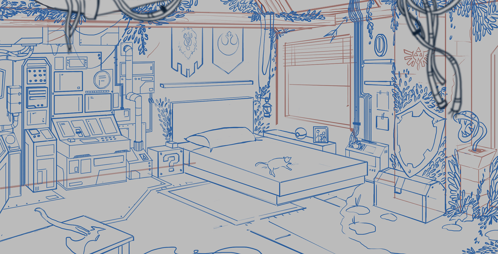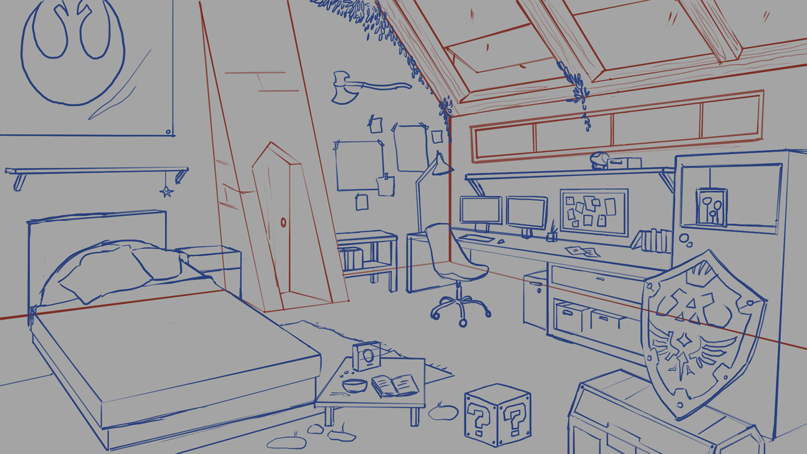GJQ459 was a very fun project to work on. I was responsible for the initial concept and sketch exploration of a gamer room environment. The space was inspired by the client’s favorite video games, envisioning the perfect room for a rather peculiar character. Through these early sketches, we explored the layout, atmosphere, and key visual elements that would define the space.